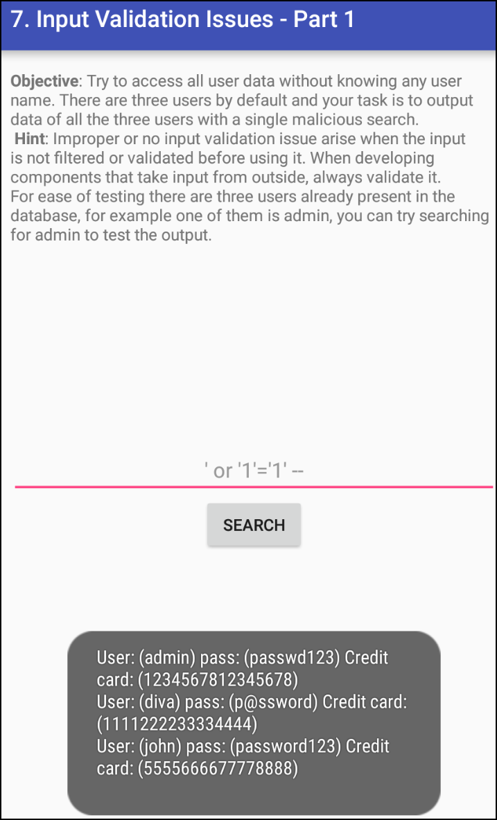 Logcat 정보를 보면 SQL 쿼리 SELECT * FROM sqliuser WHERE user = ''' 오류가가 보이는 것을 알 수 있다.