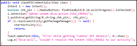 jakhar.aseem.diva/.APICreds2Activity 액티비티를 호출할 때 --ez옵션을 통해 check_pin의 값을 false로 지정했다.
