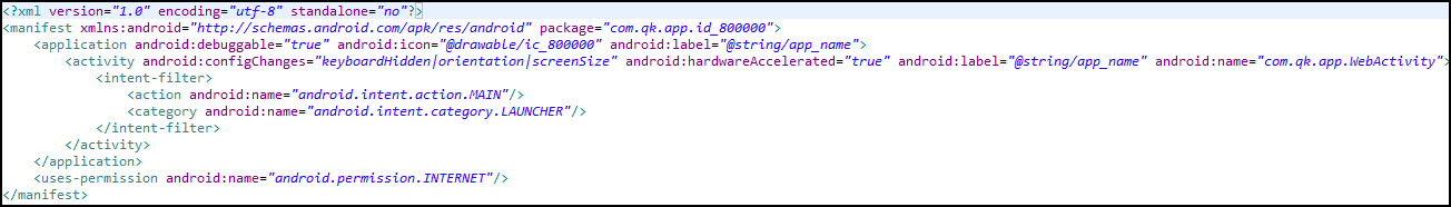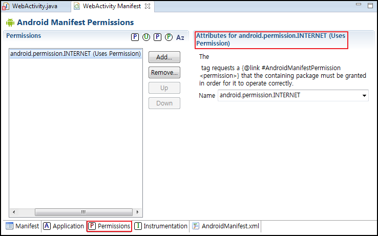 WebActivity Manifest에서 Permissions 메뉴를 보면 권한을 자동으로 보여준다. 인터넷 접속 권한을 사용하는 것을 알 수 있다.