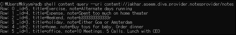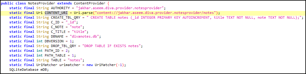 소스코드를 보면 jakhar.aseem.diva.NotesProvider의 exported가 true로 설정되어 있는 것을 확인할 수 있다. provider를 통해 외부에서 해당 content를 불러올 수 있다.