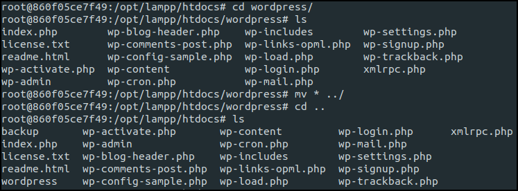 cp 명령어로 wordpress를 컨테이너로 복사했다.