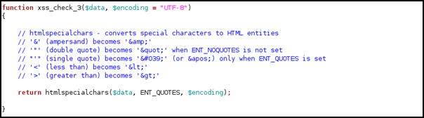 htmlspecialchars 함수를 호출하여 입력 데이터를 UTF-8로 인코딩한다. 두 번째 인자에 ENT_QUOTES를 추가하여 XSS에 사용되는 특수 문자들을 HTML 엔티티 코드로 변환하여 스크립트 코드를 입력하여도 웹 브라우저에서는 문자로 인식한다.