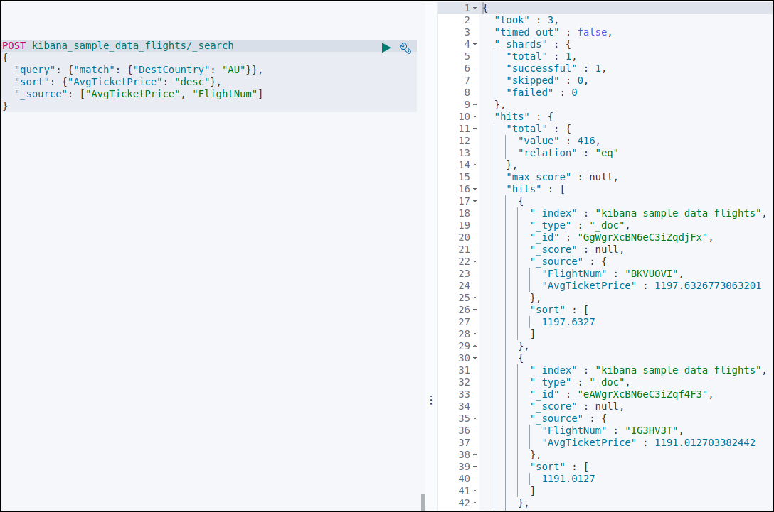 DestCountry: AU, AvgTicketPrice, FlightNum을 내림차순으로 정렬했다.