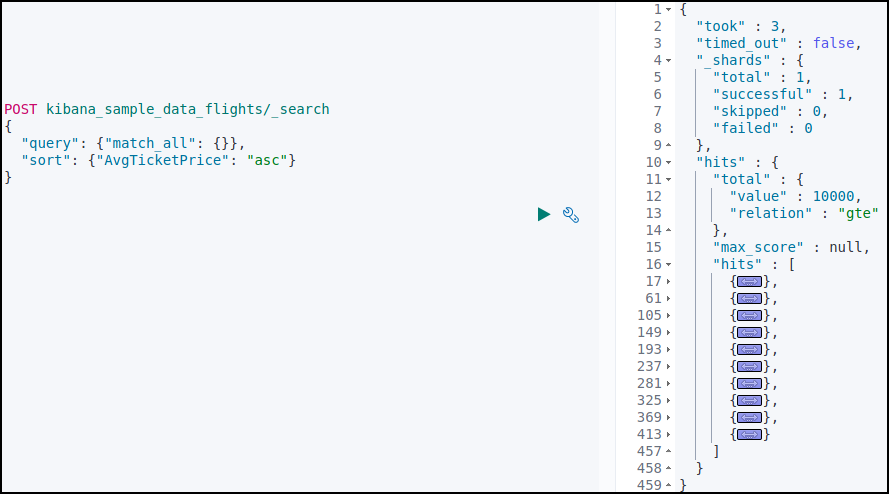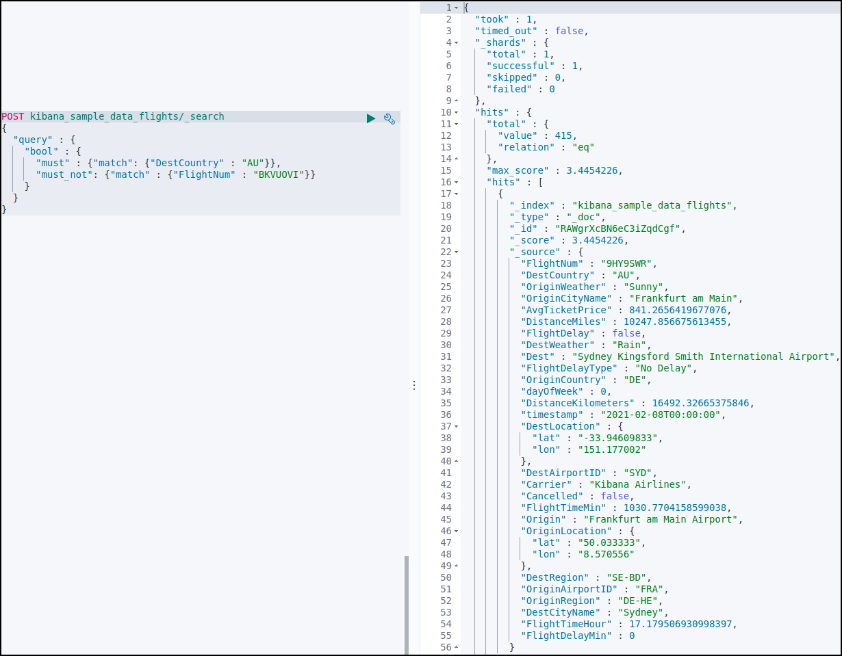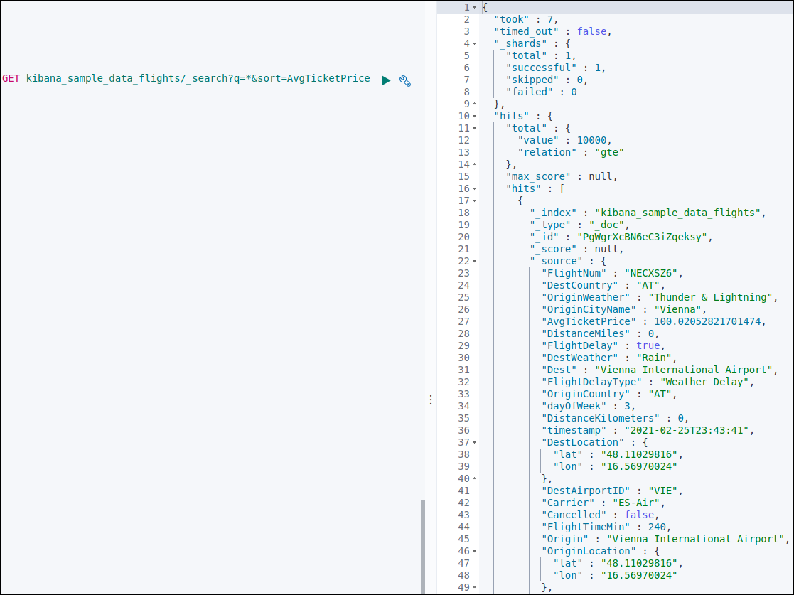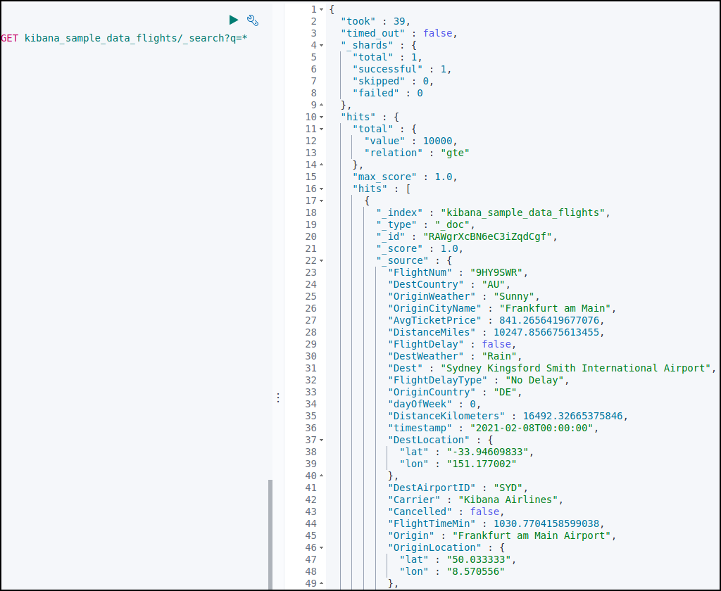 kibana_sample_data_fligths 데이터를 조회했다.