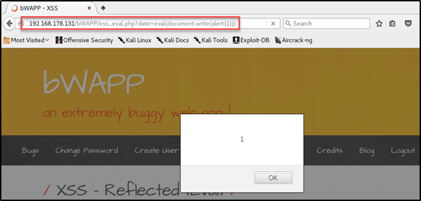 Eval 함수에 document.write(alert(1)))를 입력해 경고창을 확인했다.