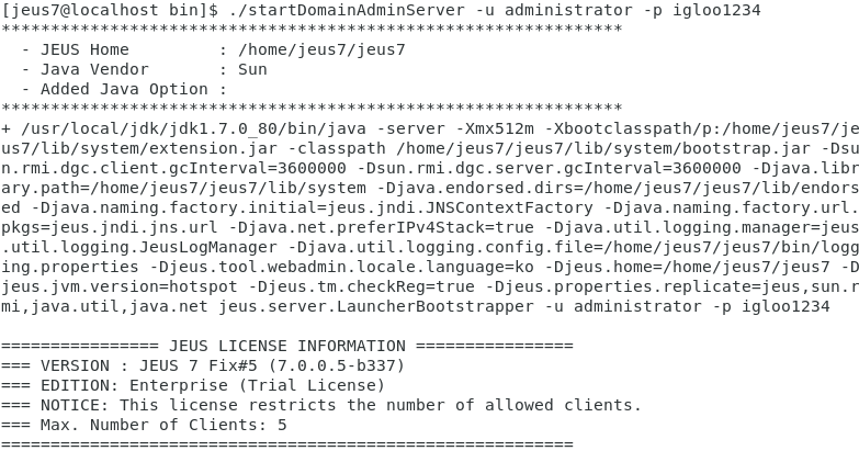 startDomainAdminServer 명령어를 입력해 JEUS 7 도메인을 구동