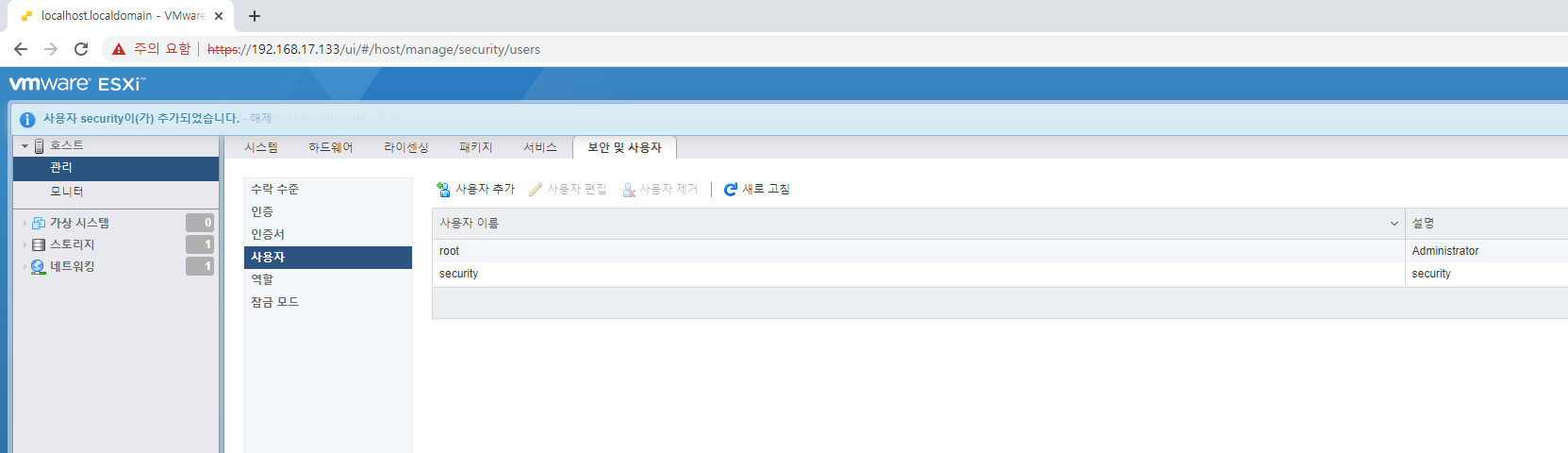 관리 > 보안 및 사용자 > 사용자 security 계정 추가