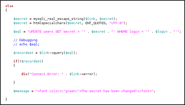 mysqli_real_escape_string 함수를 사용하여 Null, \n, \r, \ ‘, “, ^Z에 백슬래시를 추가하여 SQL 인젝션 공격을 방어한다. htmlspecialchars 함수를 호출하여 입력 데이터를 UTF-8로 반환하여 HTML 코드에 사용되는 문자들을 HTML 엔티티 코드로 변환한다.