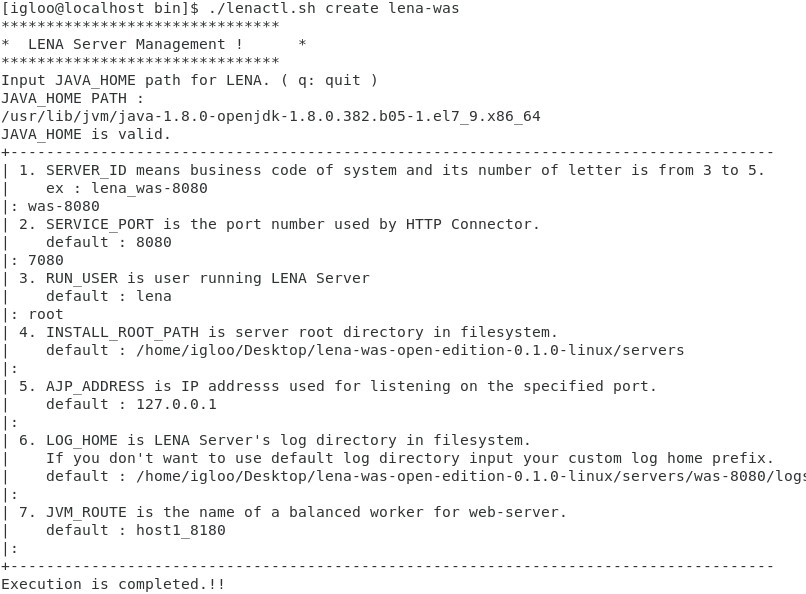 lenactl.sh create lena-was 명령어로 실행하면 디렉터리 이름 설정 후 포트 설정 그리고 존재하는 계정을 입력한다.