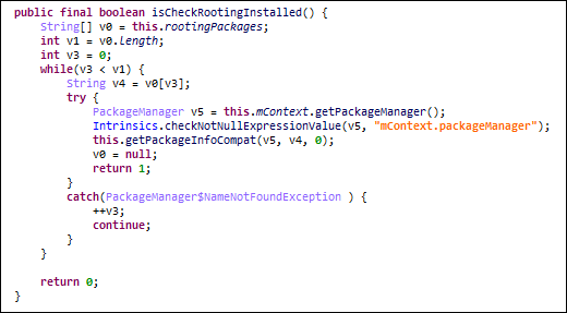 isCheckRootingInstalled() 함수는 Bypass Packages 탐지 결과를 반환해 주는 역할을 한다. 코드를 보면 rootingPackages에서 패키지 목록을 가져오고 있으며 getPackagesInfoCompat() 함수를 통해 가져온 패키지 정보를 반환받게 된다. 패키지 정보가 있을 경우 디바이스에 해당 패키지가 설치되어 있는 것으로 판단해 탐지하게 된다.