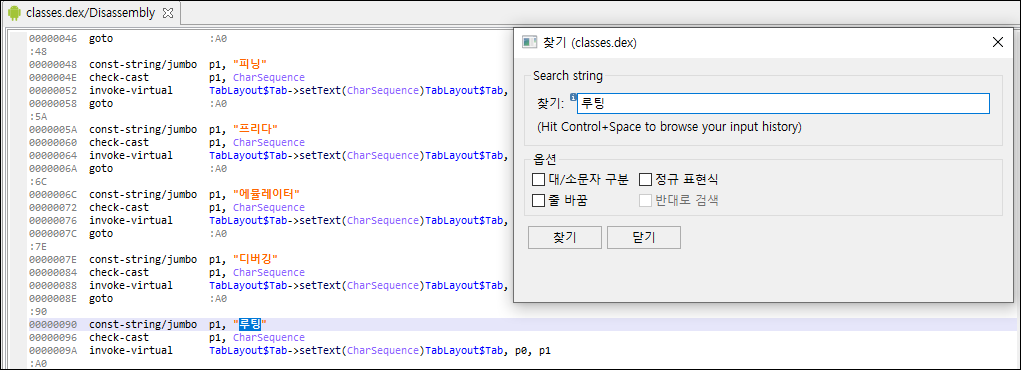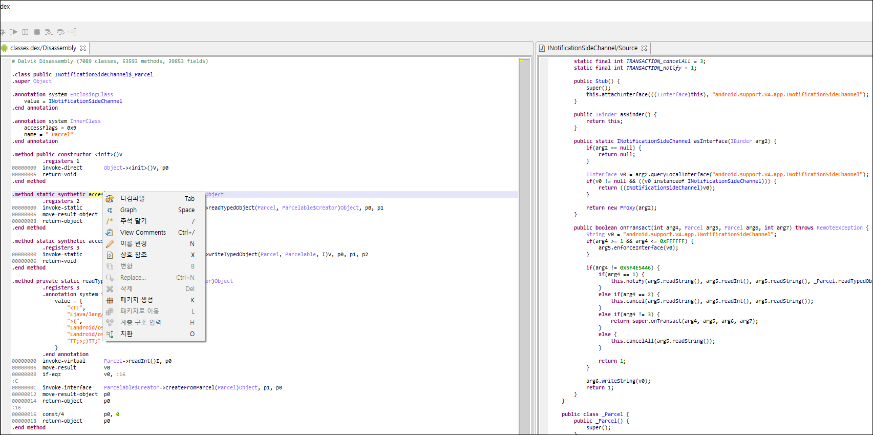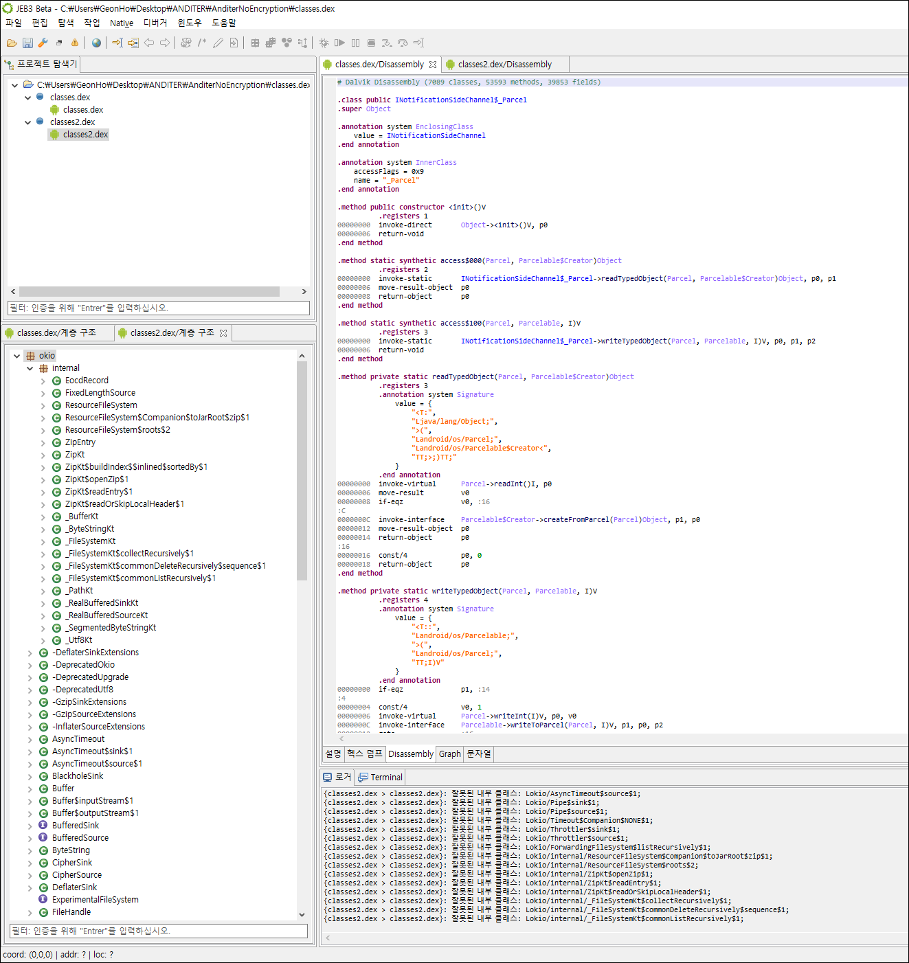 APK 파일을 압축푼 후에 JEB 프로그램을 이용하여 class.dex파일을 열어봄