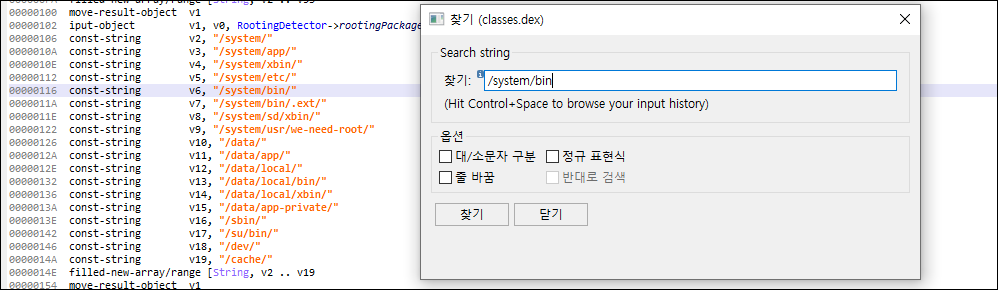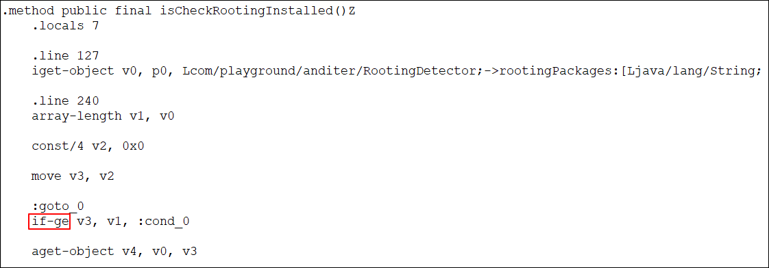 isCheckRootingInstalled() 변조할 Smali 코드이다. Smali 코드 구문이 Java 소스코드의 while문 조건 구문이며 v4, v2 레지스터리에 저장된 값을 비교해 v3 값이 v1 보다 클 경우 38(return)로 이동하게 된다. 그래서 Smali 코드 구문의 조건문을 참으로 만들어 38로 이동시킨 다음 false 값을 반환할 수 있도록 변조하면 된다.