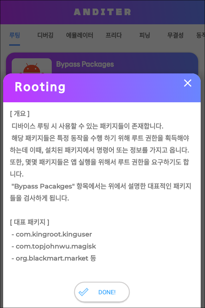 - Bypass Packages 항목은 디바이스에 설치된 앱 패키지 목록을 검사하여 루팅 시 설치되는 앱 또는 루팅 디바이스에서만 활용되는 앱들이 존재하는 확인한다.