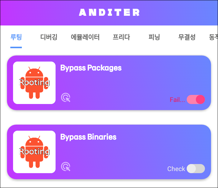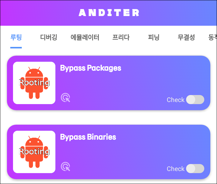 - 대표적인 앱으로는 magisk, BusyBox, Toolkit, Dex Manager 등이 있으며, 이러한 앱들은 특정 동작 수행을 위해 관리자 권한을 획득하거나 또는 디바이스 정보를 변경하는 데 사용된다.