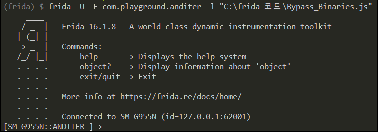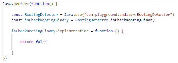 isCheckRootingBinary를 찾아가지 않고 frida 코드가 실행되어 우회하여 탐지가 되지 않도록 false 값으로 return 한다.