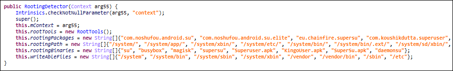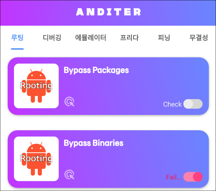 - Bypass Binaries 항목은 디바이스 내의 바이너리 파일들을 검사하여 루팅 시 사용되는 명령어 파일들이 존재할 경우 루팅 디바이스로 판단하여 탐지한다.