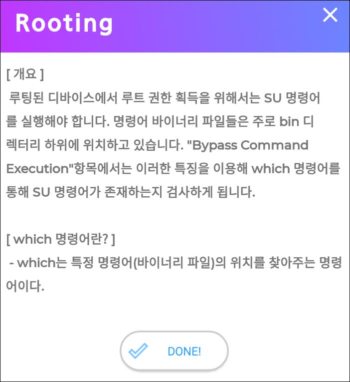- Bypass Command Execution 항목은 이러한 특징을 이용하여 which 명령어를 사용해 PATH 변수에 등록된 디렉터리 경로에 "su" 바이너리 파일이 위치하는지 검사하고 파일 존재 시 루팅 디바이스로 판단하여 탐지하게 된다.