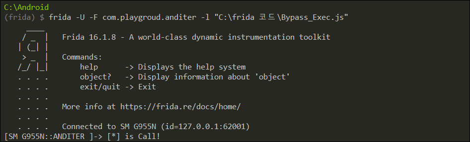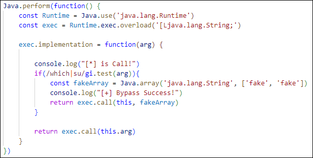 exec() 함수 사용을 위해 Runtime 클래스 객체를 반환받고 isCheckRootingExec()에서 exec() 함수 호출 시 전달되는 인수의 데이터 타입에 맞춰 exec() 함수를 오버로딩으로 구현했다. 함수로 들어오는 매개 변수 중 su, which 문자열이 포함되어 있을 경우 더미 값 fake로 변조하고 변조한 더미 값을 인수로 원본 exec() 함수를 호출해 결과 값을 반환하게 된다.