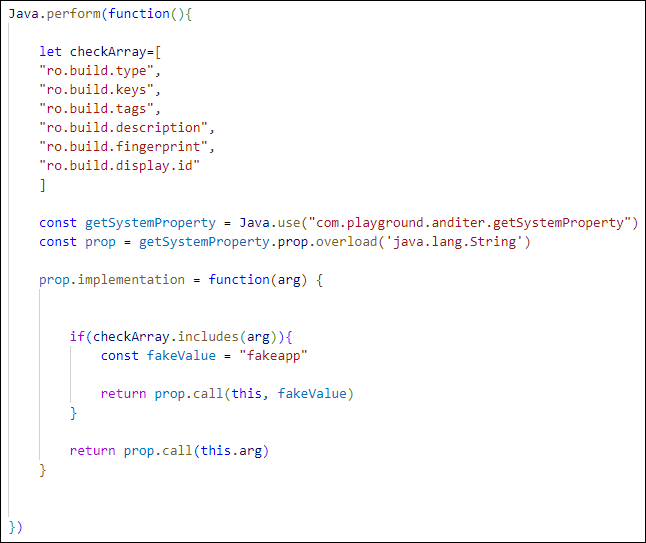 isCheckRootingKeys() 함수에서 prop() 함수 호출 시 전달 했던 시스템 속성을 그대로 가져와 리스트로 선언했고 prop() 함수 사용을 위해 getSystemProperty 클래스 객체를 반환받았다. prop() 함수로 들어오는 매개 변숫값이 선언한 리스트에 포함되어 있을 경우 더미 값으로 변조하고 변조한 더미 값을 인수로 원본 prop 함수를 호출해 결괏값을 반환한다