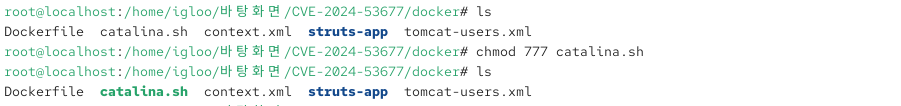 docker 디렉터리로 이동 후 catalina.sh 파일의 권한을 777로 변경을 해준다