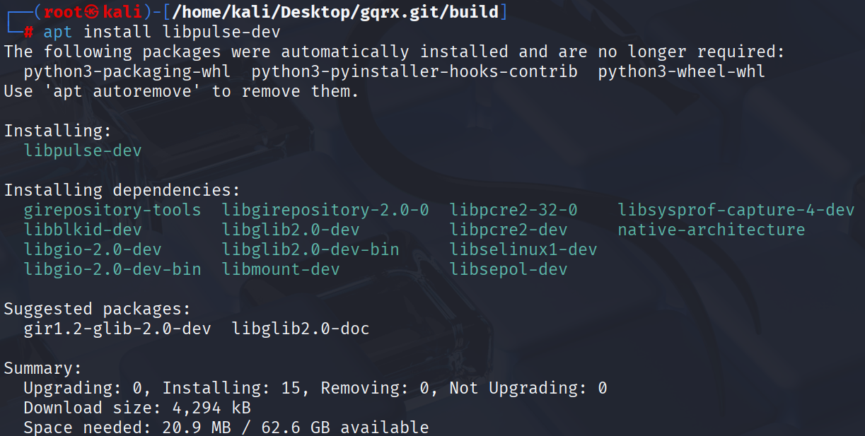 libpulse 라이브러리의 개발 헤더와 CMake 구성 파일을 포함하고 있어 설치를 진행해 준다.