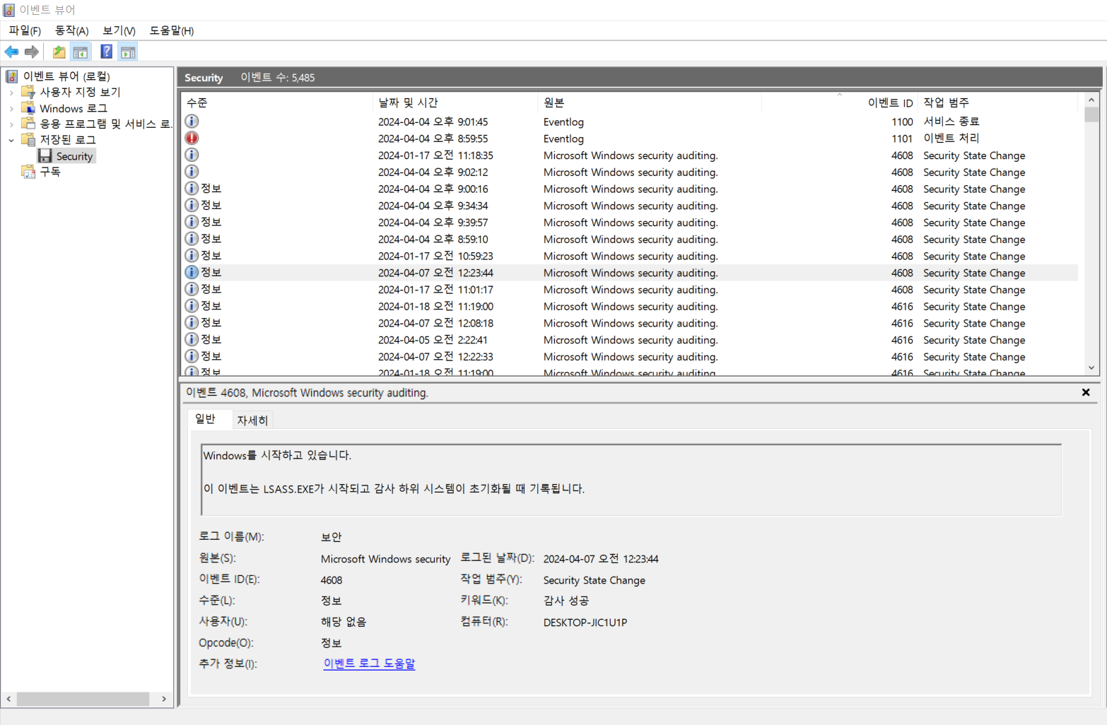 윈도우 시작을 알려주는 이벤트 ID 4068만 볼 수 있도록 정렬 후 날짜 및 시간을 확인한다.