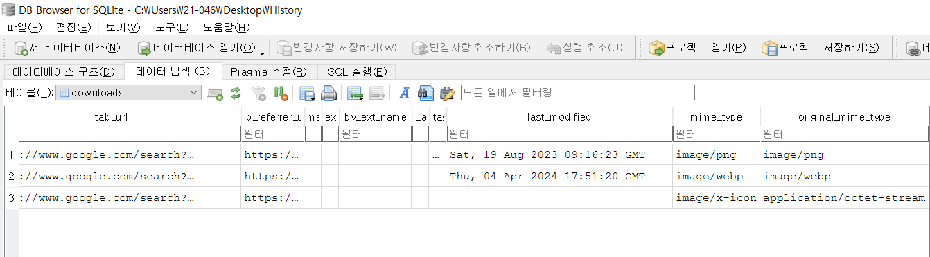 DB Browser 프로그램을 이용하여 History 내용을 보면 Dtatfalonso-Android-L-Chrome 파일 이름과 Start_time 값을 알 수 있다.