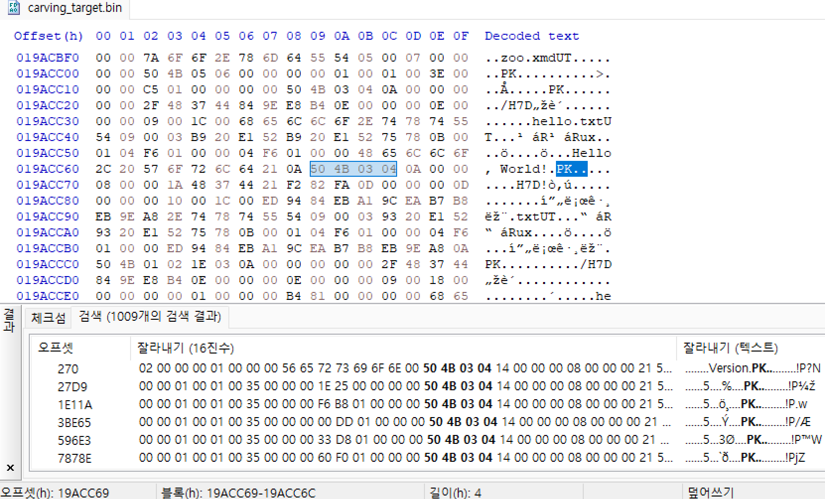 HxD 프로그램을 이용하여 문제 파일을 열어보면 문제에서 ZIP파일이라는 것을 알 수 있다. ZIP 파일의 헤더인 50 4B 03 04 를 찾아보면 1009개의 검색되는 것을 알 수 있다.