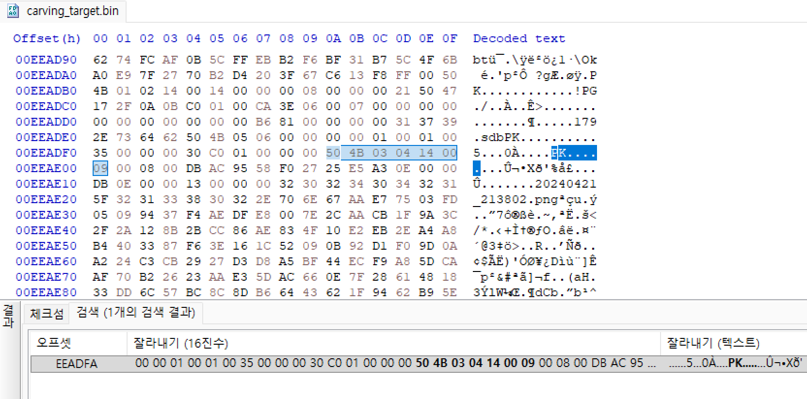 50 4B 03 04 14 00 08은 39개의 결과가 나오고 50 4B 03 04 14 00 09는 1개의 결과만 보여주는 것을 알 수 있다.