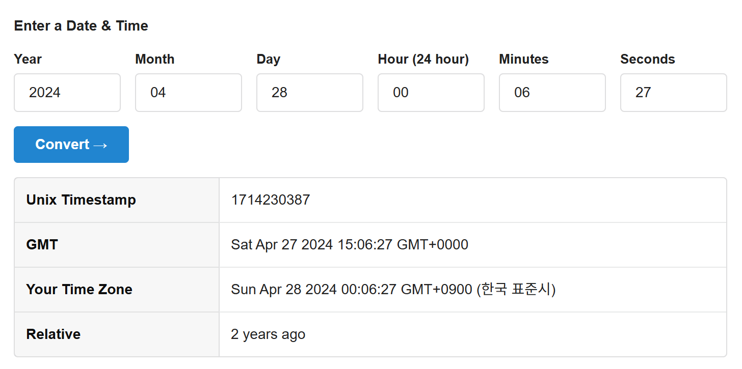 해당 악성 프로세스가 종료된 시간이 UTC 시간이므로 한국 시간으로 변경 후 입력하여 UNIX Timestamp 확인하였다.
