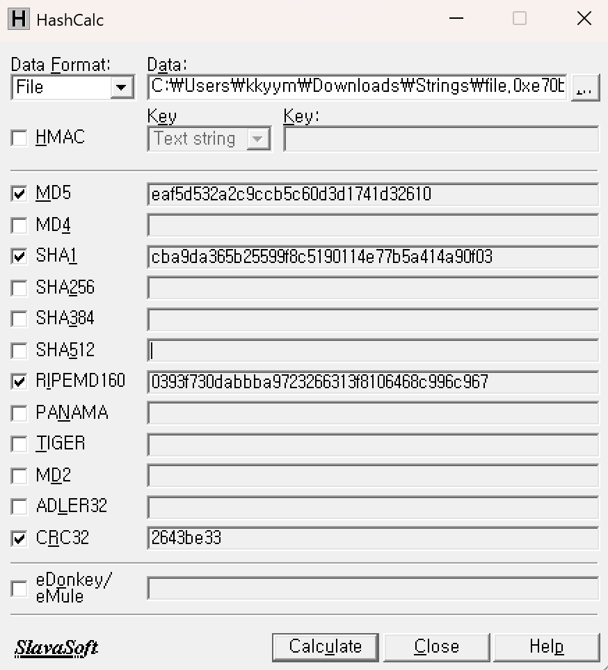HashCalc 도구를 이용하여 MD5 해시 값을 확인하였다.