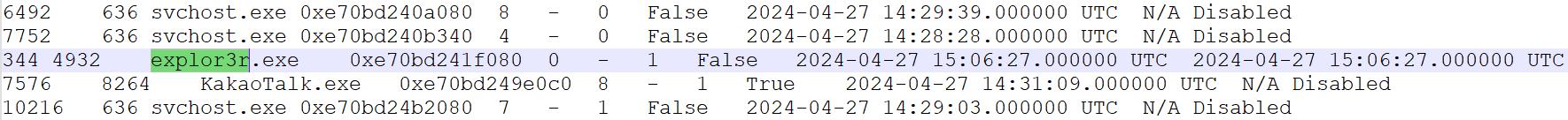 수집한 psscan에서 explor3r.exe 수상한 프로세스를 확인할 수 있습니다.