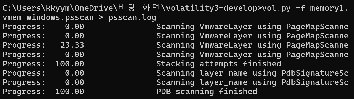 볼라틸리티 플러그인 windows.psscan를 이용하여 살아있는 프로세스를 확인하려고 했다.
