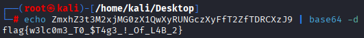 해당 문자열을 ZmxhZ3t3M2xjMG0zX1QwXyRUNGczXyFfT2ZfTDRCXzJ9 base64를 디코딩하면 아래와 같이 flag{w3lc0m3_T0_$T4g3_!_Of_L4B_2} 알 수 있습니다.