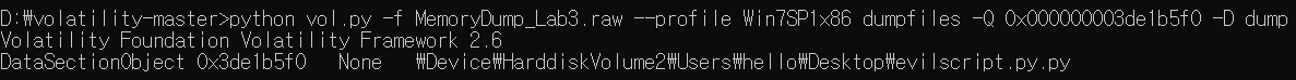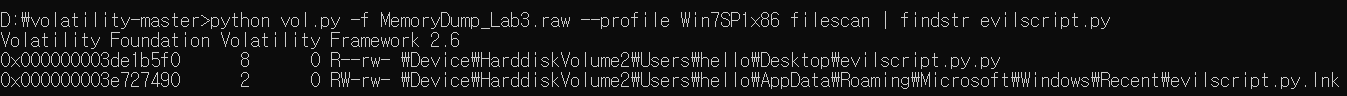 python vol.py -f MemoryDump_Lab3.raw --profile Win7SP1x86 filescan | findstr evilscript.py
