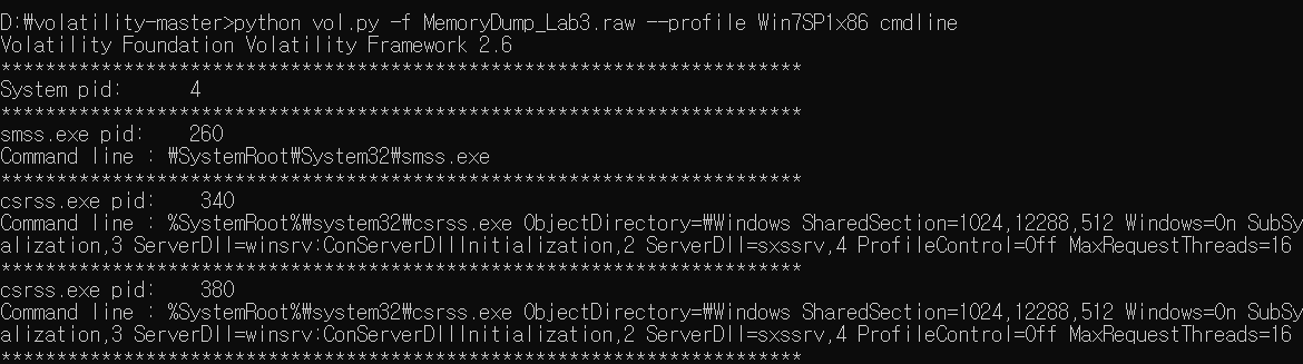 python vol.py -f MemoryDump_Lab3.raw --profile Win7SP1x86 cmdline