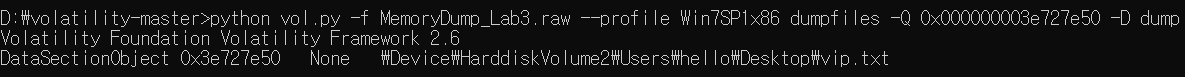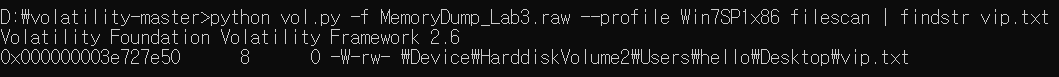 python vol.py -f MemoryDump_Lab3.raw --profile Win7SP1x86 filescan | findstr vip.txt