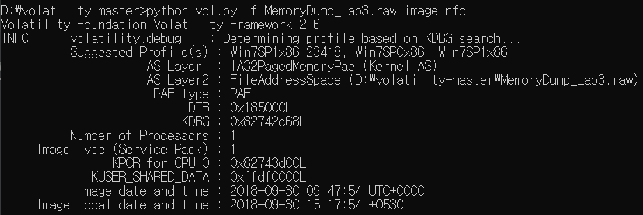 python vol.py -f MemoryDump_Lab3.raw imageinfo