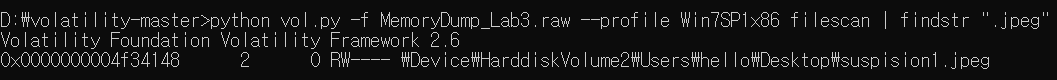 python vol.py -f MemoryDump_Lab3.raw --profile Win7SP1x86 filescan | findstr ".jpeg"