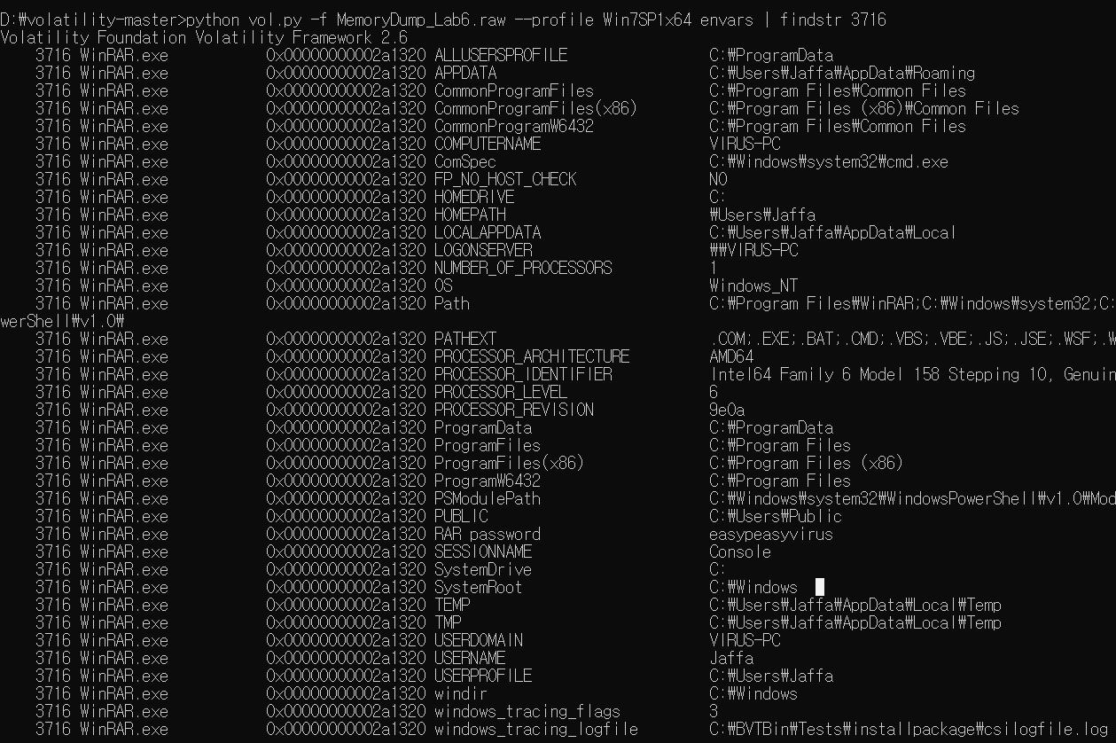 python vol.py -f MemoryDump_Lab6.raw --profile Win7SP1x64 cmdline | findstr WinRAR.exe