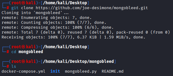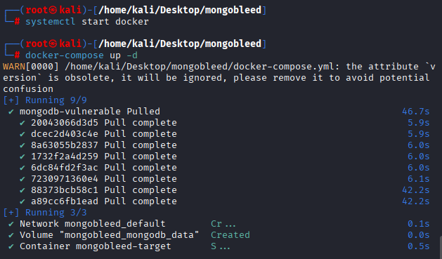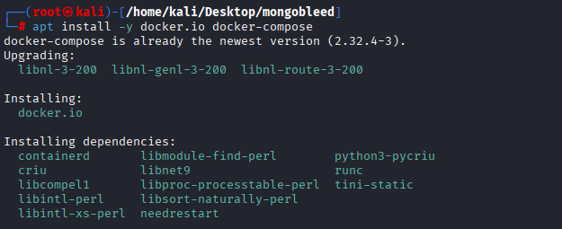 docker 컨테이너를 실행시킨 후 mongobleed 경로에서 docker-compose 파일에 정의된 컨테이너를 설치합니다.