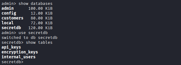 MongoDB에 admin 계정으로 로그인하여 databases, tables 확인할 수 있습니다.