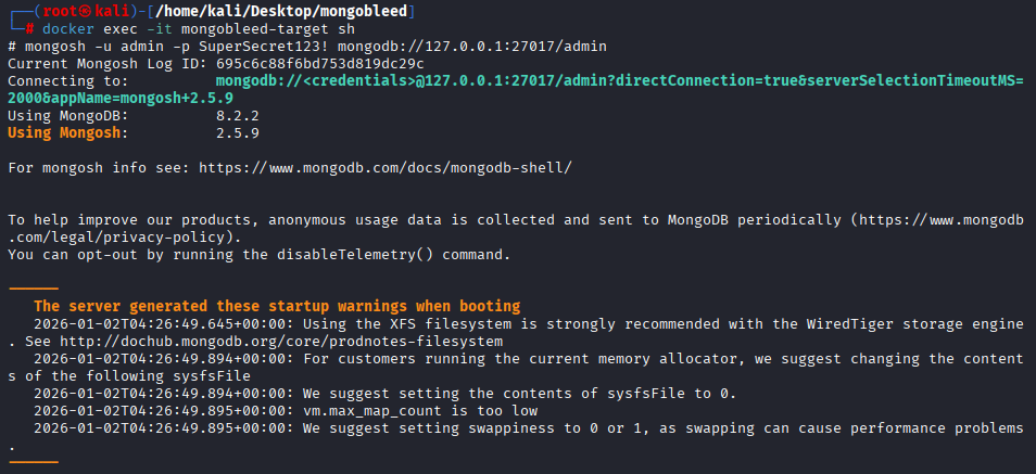 docker-compose 파일을 보면 mongobleed 취약한 버전에 해당되는 8.2.2라는 것을 알 수 있습니다.