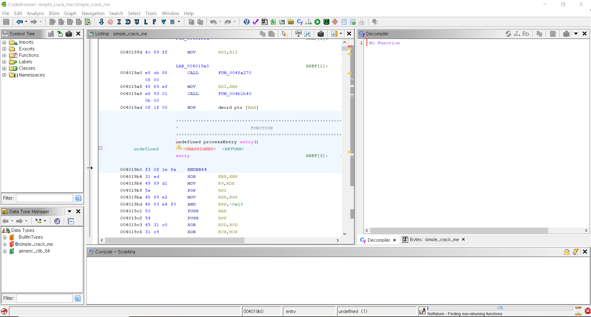 Ghidra 설치 후 [File] - [New Project]에서 simple crack me 프로젝트 생성 후 simple_crack_me 불러옵니다.