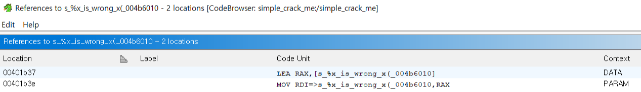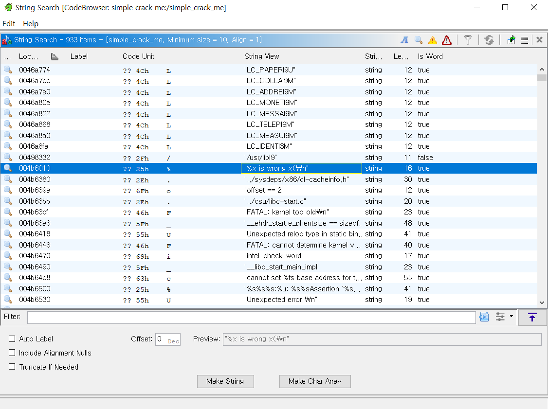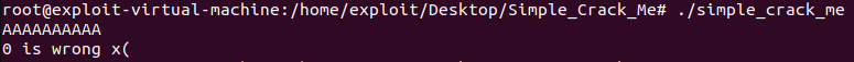 simple_crack_me 실행 시킨 후 AAAAAAAAAA 문자를 입력 시 wrong 메시지를 보이는 것을 알 수 있습니다.