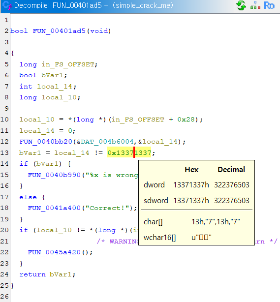Ghidra 오른쪽 메뉴를 보면 소스코드를 보여주는 것을 알 수 있습니다. 소스코드의 내용을 보면 0x13371337을 입력해 주면 "Correct!" 문자열을 보여주는 것을 알 수 있습니다.