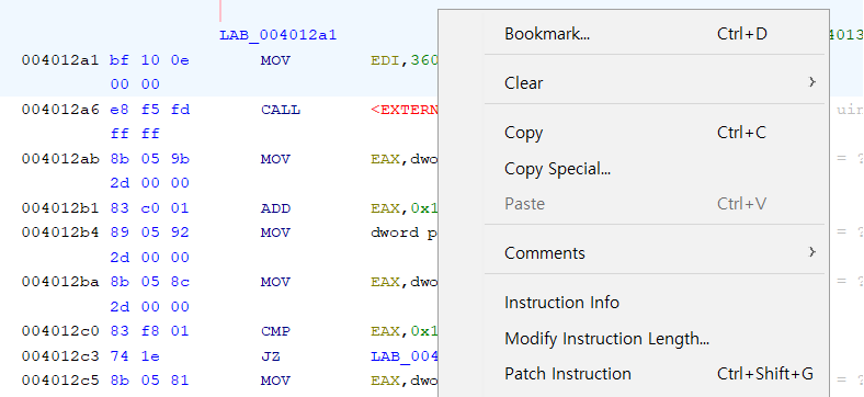 해당 부분을 마우스 오른쪽 클릭 후 [Patch Instruction] 기능을 선택합니다.