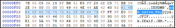 중간 정도 내려오면 “and_extra_Key” 문자열을 확인할 수 있다. 그리고 JFIF를 보고 JPEG 확장자를 알 수 있다. (FF FF FF ~ 하단까지 복사)