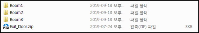 문제를 보면 Room1, Room2, Room3 폴더를 확인할 수 있고 마지막으로 Exit_Door.zip 압축파일을 해제하면 되는 문제인 것 같다.