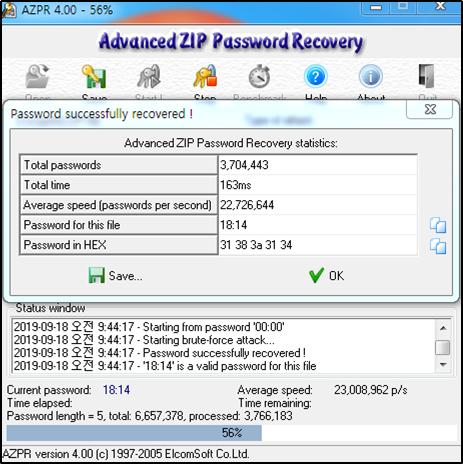 AZPR 압축파일 Password 푸는 프로그램을 이용해 쉽게 풀 수 있다.
